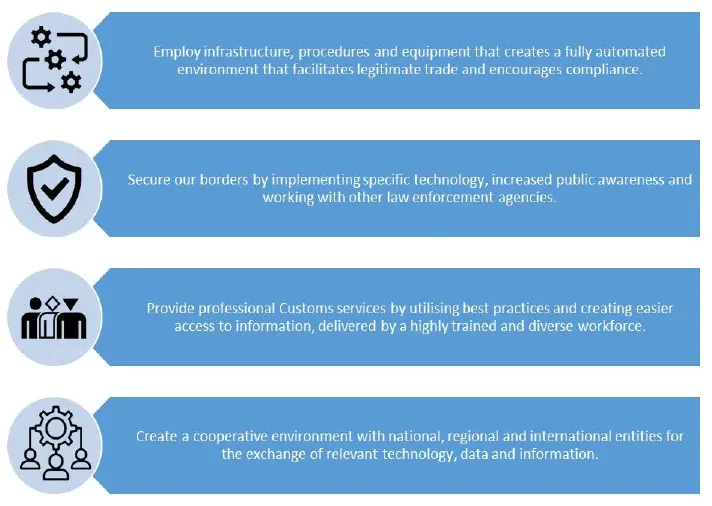 Provide professional Customs services through effective utilisation of modern technology, networking with stakeholders and legislation that facilitates legitimate trade while protecting our borders.